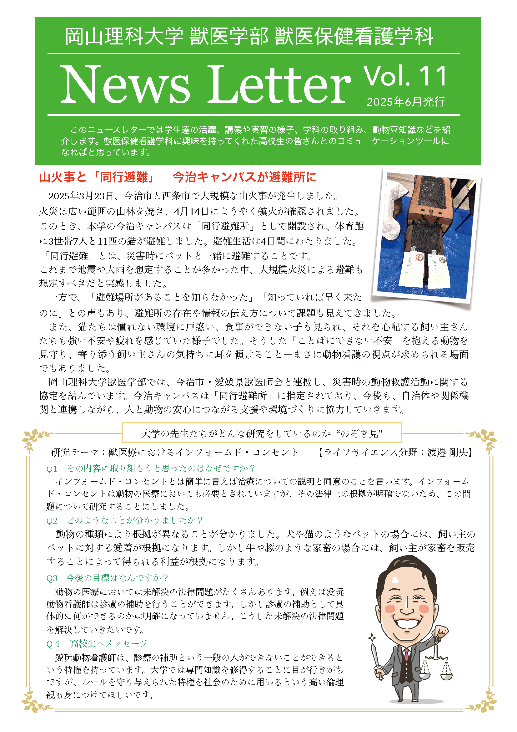 この「News Letter」では学生達の活躍、講義や実習の様子、学科の取り組み、動物豆知識などを紹介します。