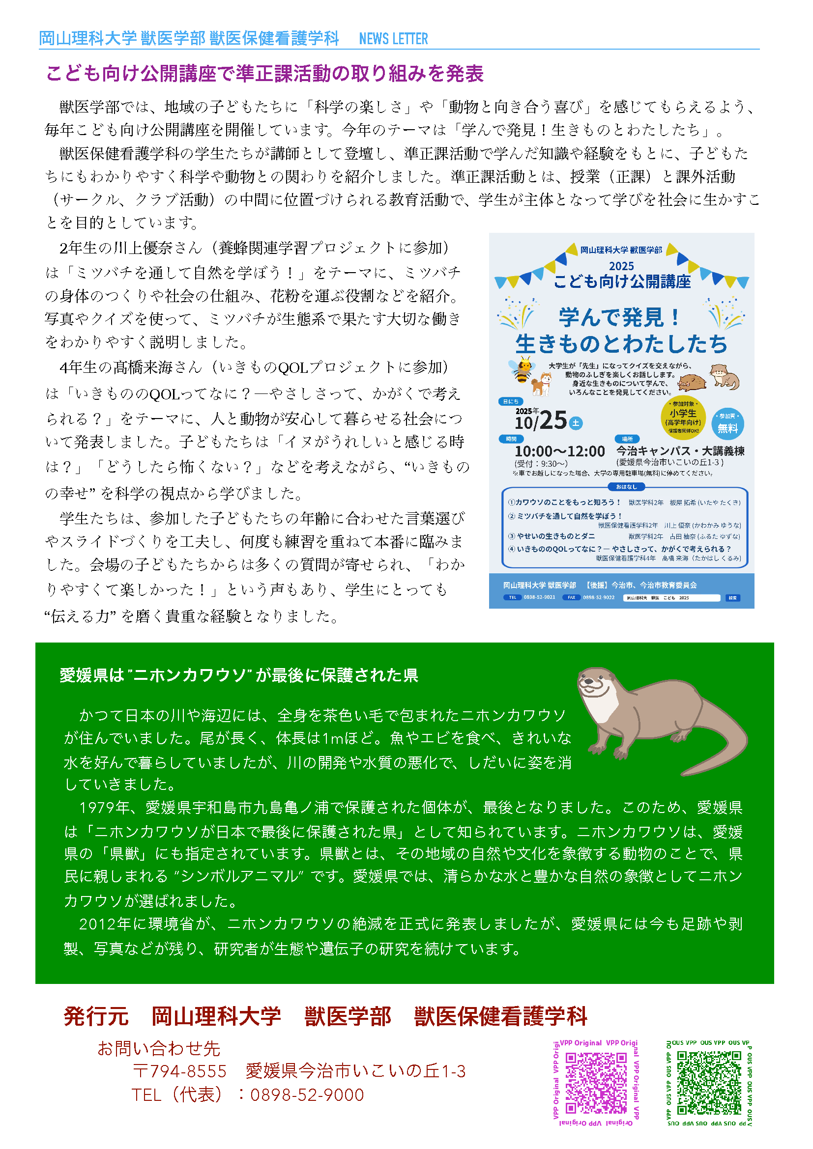 学生たちが、こども向け公開講座で準正課活動の取り組みを発表した様子と愛媛県にまつわるニホンカワウソの豆知識を紹介します(2面)。