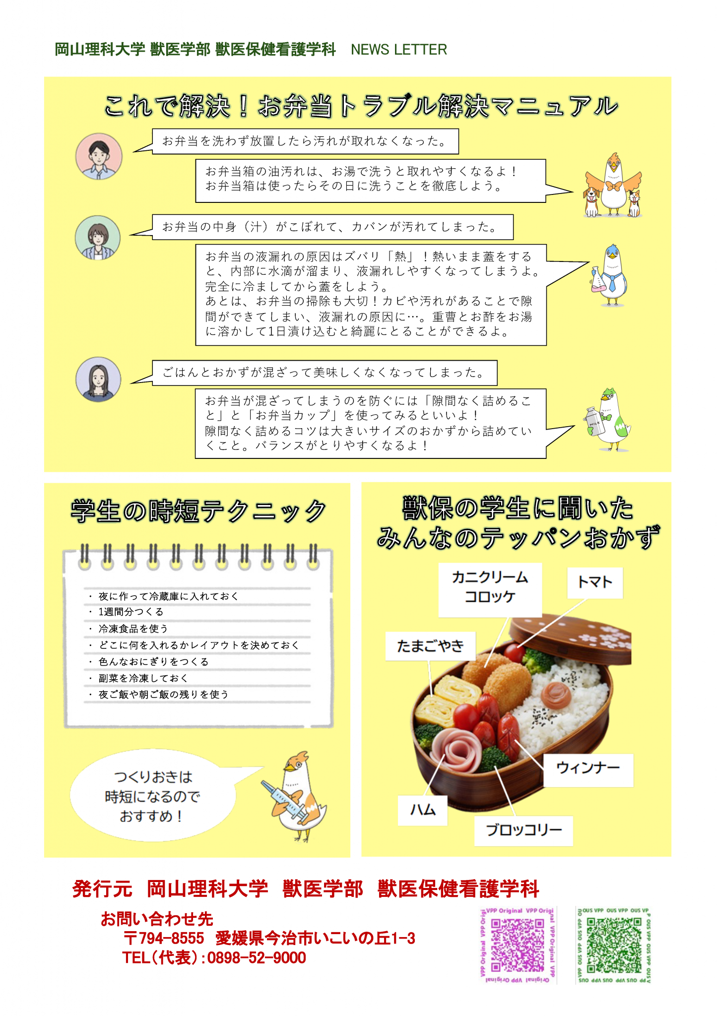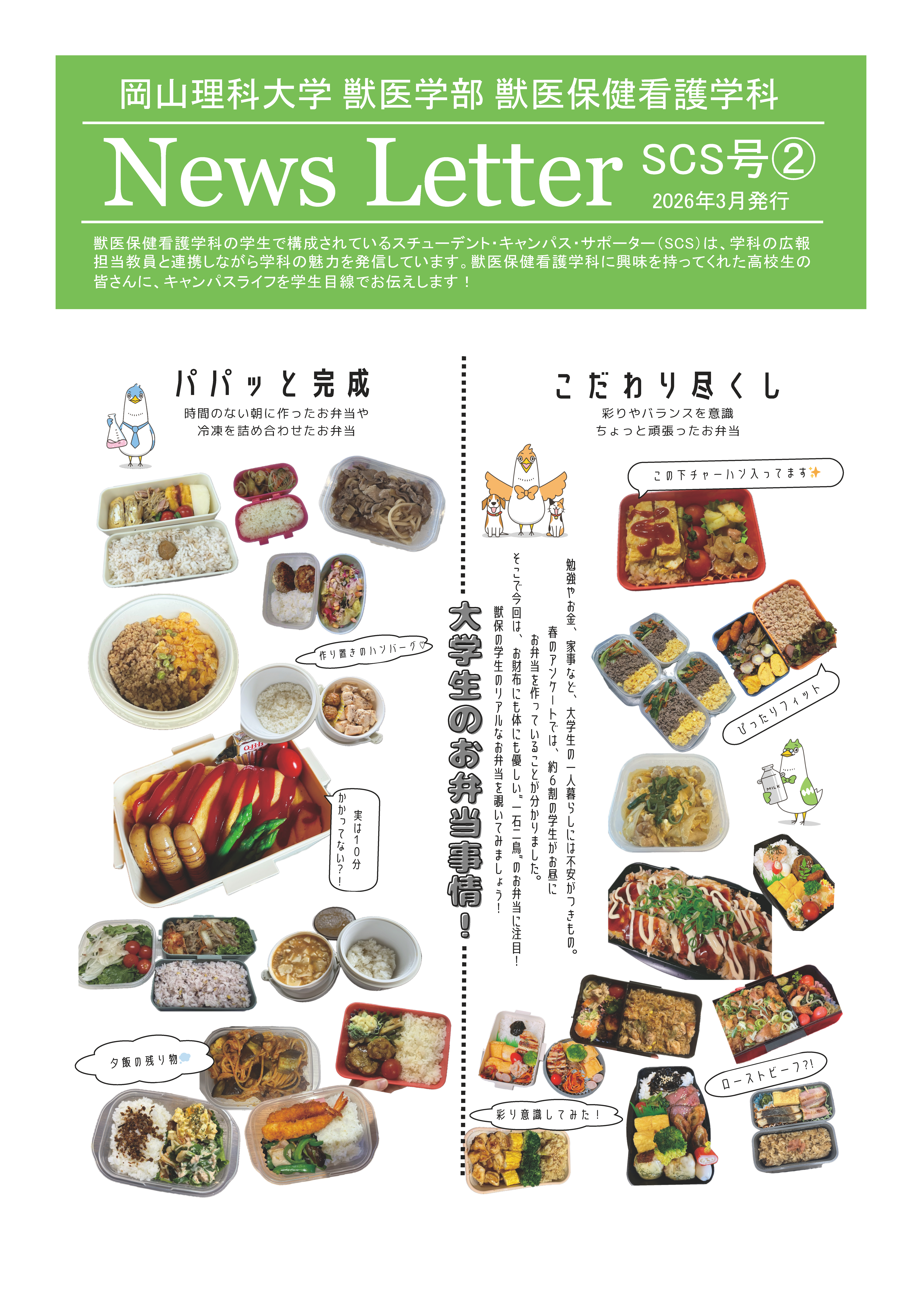 1面は、「動物生活環境学」の紹介と大学の先生たちがどのような研究をしているのか紹介する企画の第3弾です。2面は、獣医保健看護学科の新しい仲間、マスコットキャラクターを紹介します。