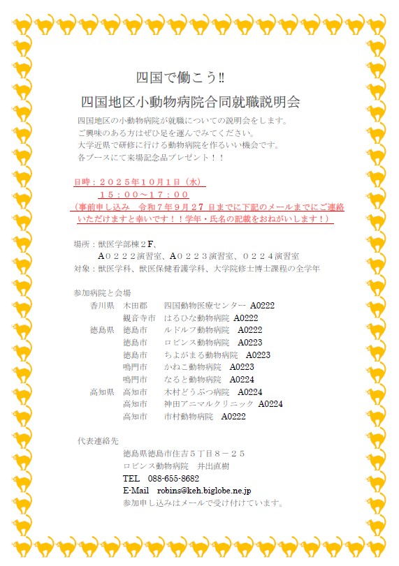 4 事前申込 件名に「四国地区小動物病院合同就職説明会参加希望」、