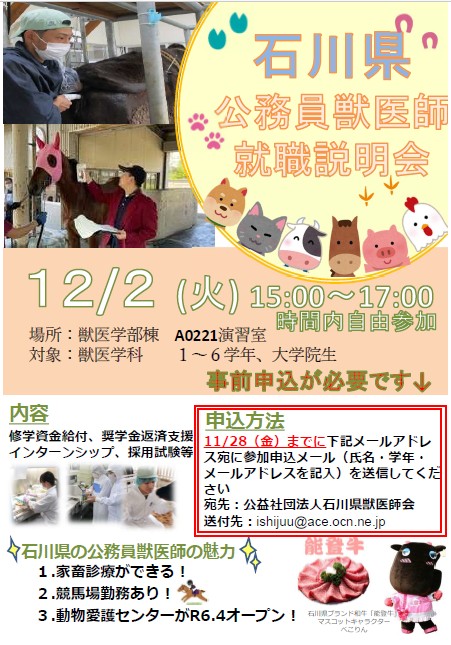 お知らせ(12/2)石川県公務員獣医師 就職説明会のご案内