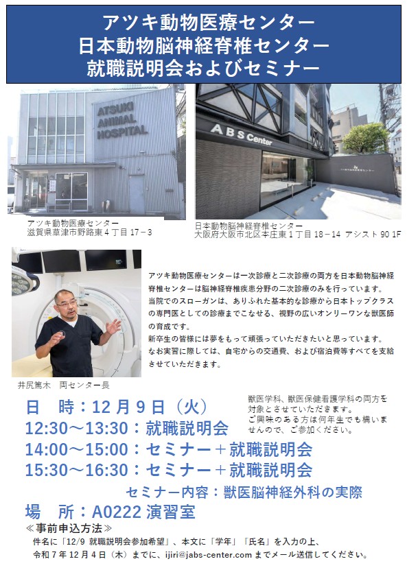 1 日 時 令和7年12月9日(火) 12:30~16:30 (1)12:30~13:30 就職説明会 (2)14:00~15:00 セミナー+就職説明会 (3)15:30~16:30 セミナー+就職説明会 2 場 所 獣医学部棟2階 A0222演習室 3 対 象 獣医学科、獣医保健看護学科 全学年 4 事前申込 件名に「12/9 就職説明会参加希望」、本文に「学年」「氏名」を入力の上、 令和7年12月4日(木)までに、ijiri@jabs-center.comへメール申し込みしてください。