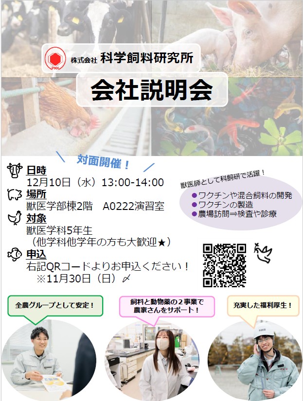 1 日 時 令和7年12月10日(水) 13:00~14:00 2 場 所 獣医学部棟2階 A0222演習室 3 対 象 獣医学科5年生(他学科他学年の方も大歓迎です) 4 事前申込 添付ファイルのQRコードから11月30日(日)までに申込してください。 5 連 絡 先 (株)科学飼料研究所 総務課(ご担当 和田様)TEL :03-6478-2381