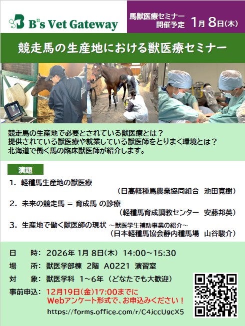1 日 時 2026年1月8日(木) 14:00~15:30 2 場 所 獣医学部棟2階 A0221 演習室 3 対 象 獣医学科 1~6年生 4 事前申込 mylogまたは獣医学部就職支援ホームページに掲示しているチラシ内のQRコード もしくはリンクよりWebアンケート形式で参加申し込みをしてください。 5 問合せ先 日本軽種馬協会 (ご担当 琴寄様) TEL :03-5473-7092