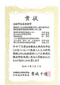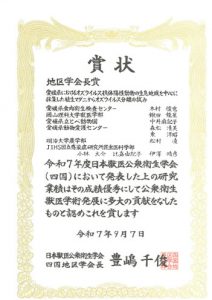学会発表・受賞報告。2025年3月9日に日本獣医生命科学大学で開催された第65回獣医疫学会学術集会において、獣医学科6年生の渡部真菜さんが「学生優秀発表賞」を受賞しました。 発表演題は「日本沿岸域の小型鯨類の腸内細菌とそれらの薬剤感受性調査」で、日本各地でストランディングしたスナメリやイルカの腸管内容物から採取した腸内細菌を対象に、薬剤耐性の実態を調査した研究です。今治キャンパスの位置する愛媛県を含む日本の鯨類での薬剤耐性菌の実態を明らかにしていきます。本研究は、獣医学科の疫学部門の太田先生を中心に指導が進められ、本学からは奥田先生、畑先生、また長崎大学の天野先生、愛媛大学の国末先生、国立科学博物館の田島先生との共同研究として実施されました。今後の研究の進展が期待されます。 |